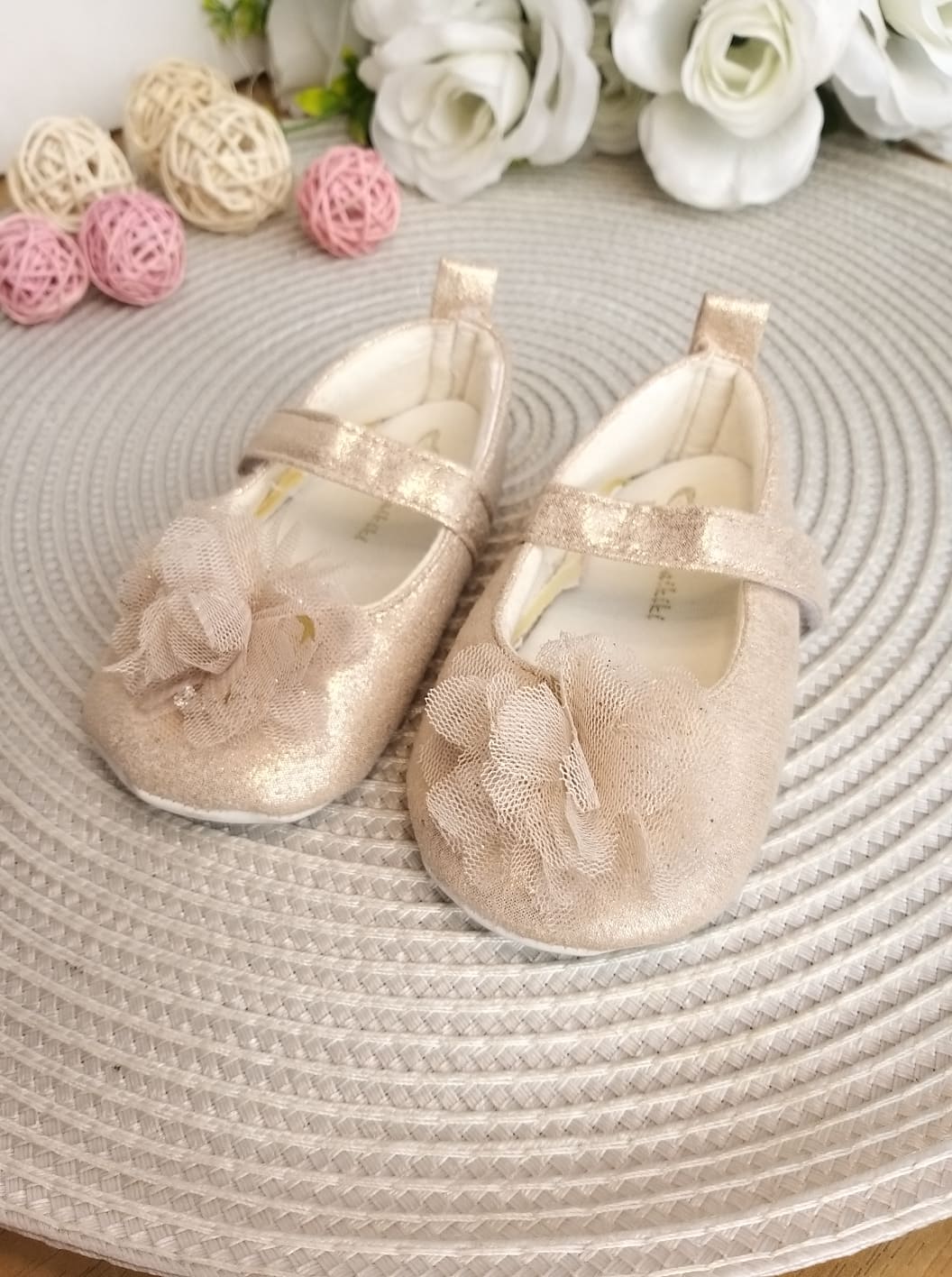 Buciki połyskujące złoto – beżowe z tiulowym kwiatuszkiem. Zapinane na rzep.
