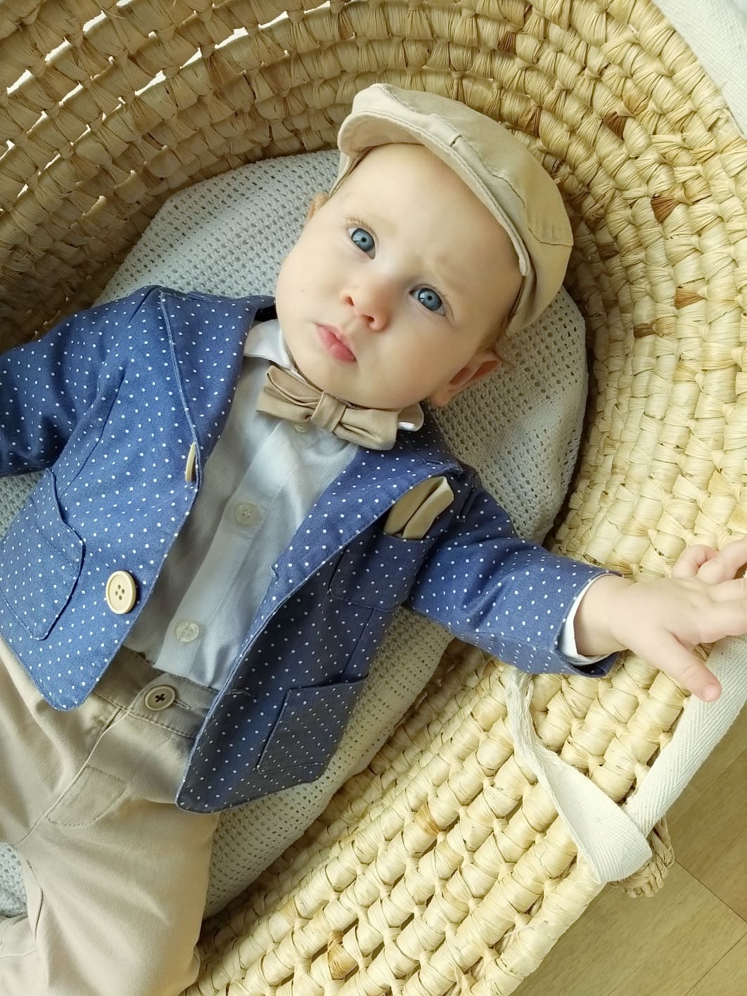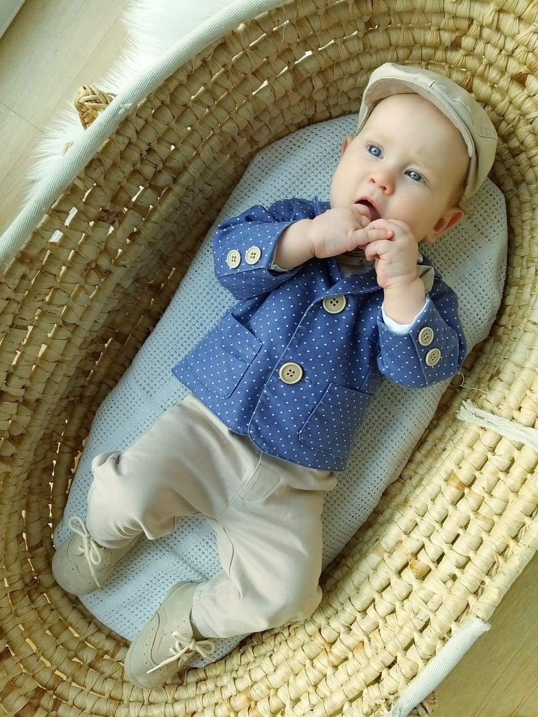 – błękitna marynarka w białe drobne kropeczki z beżowymi guziczkami