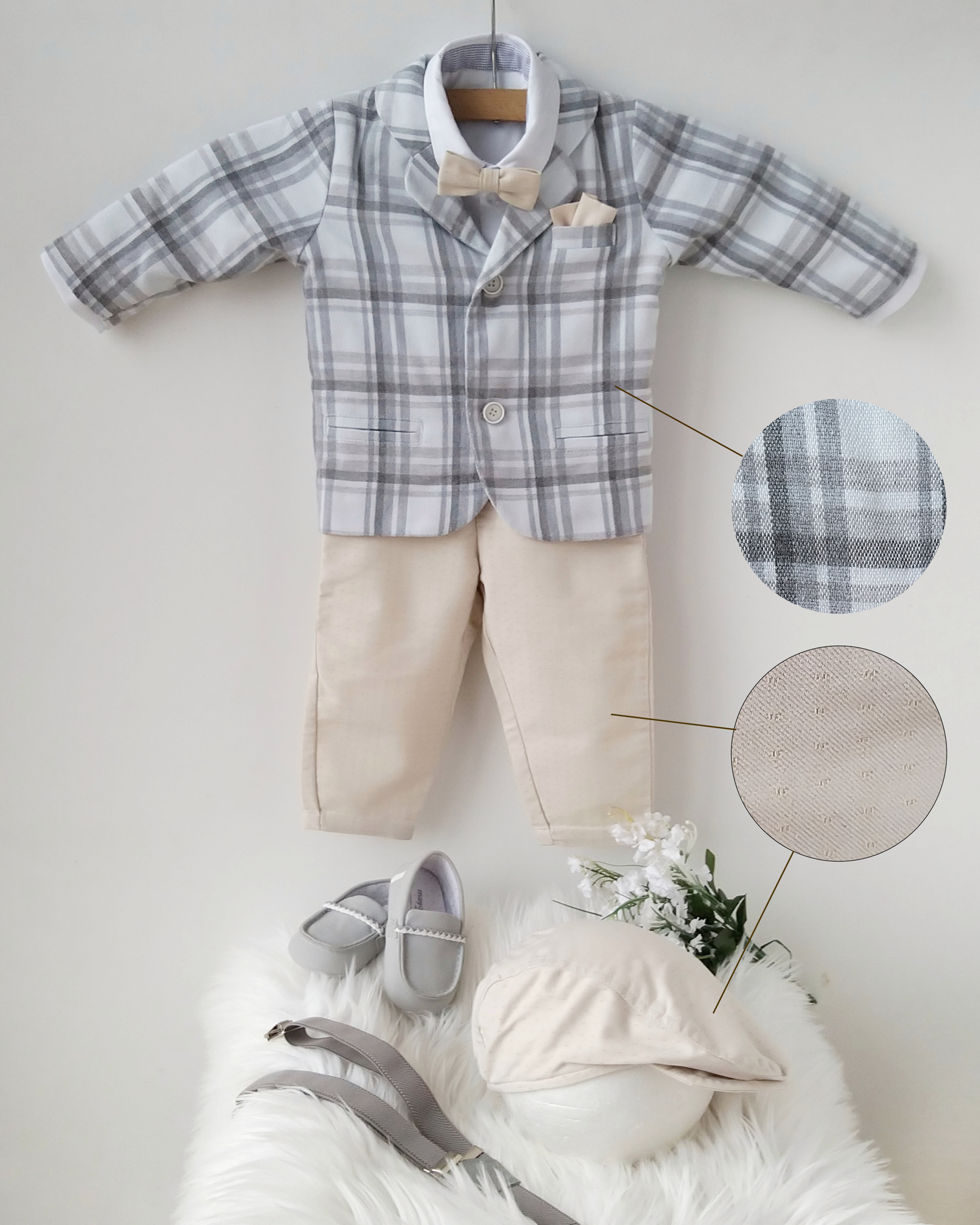 Uwaga: Widoczne dodatki na zdjęciu takie jak (poszetka, butki, czapka, szelki itd) nie wchodzą w skład garniturku. Można je wypożyczyć w dodatkowo.