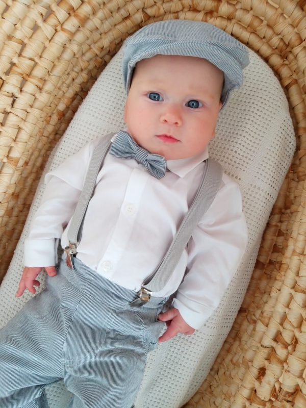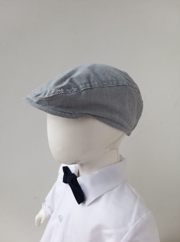 Kaszkiet chłopięcy w paseczki biało – szare marki Abrakadabra. Idealnie pasuje do garniturku Abrakadabra model Łukasz