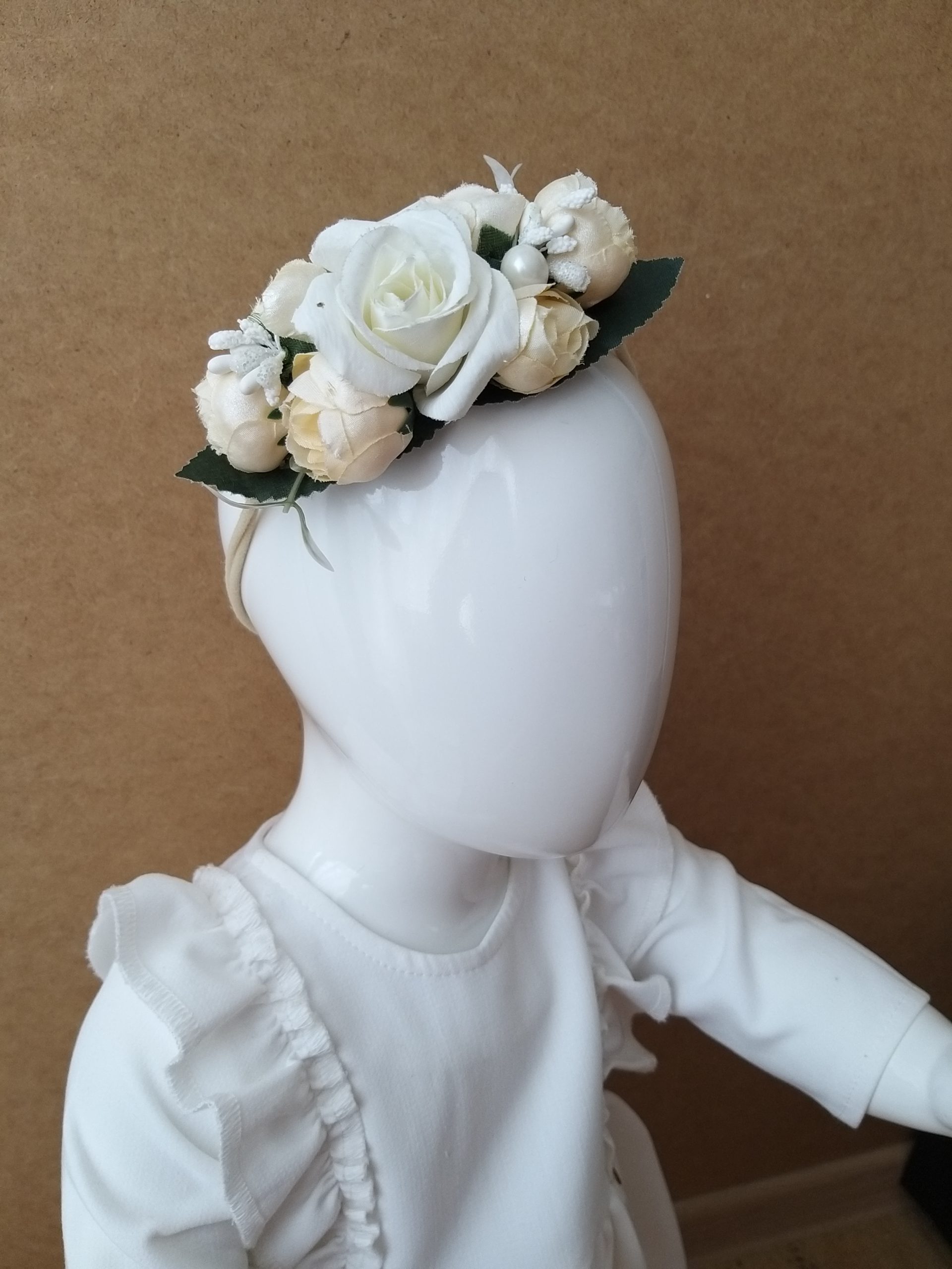 Opaska z materiałowymi kwiatuszkami śmietankowo – ecru. Gumka nie zostawia śladu na główce dziecka.