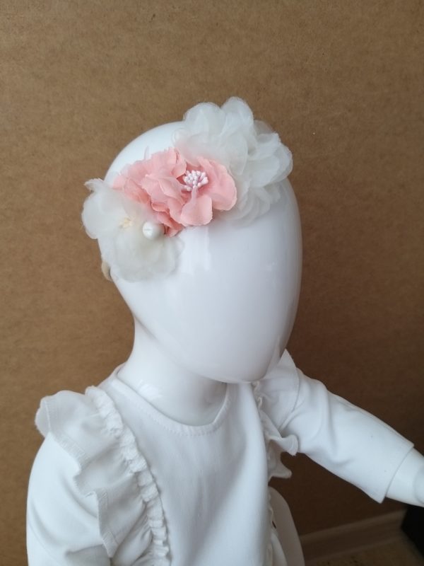 Opaska z materiałowymi kwiatuszkami śmietankowo morelowe. Gumka nie zostawia śladu na główce dziecka.