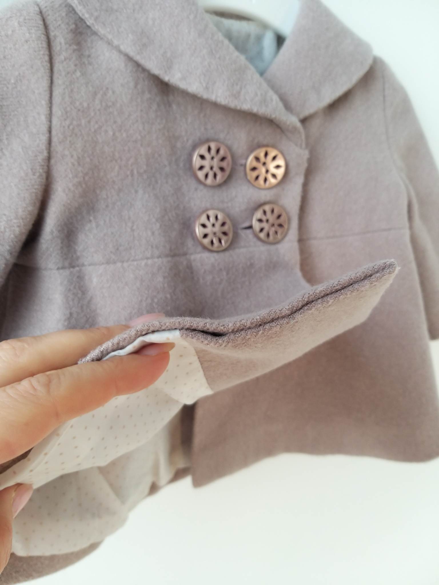 Uszyty został z miękkiego flauszu. Jest na podszewce bez dodatkowego ocieplenia. Płaszczyk ma trapezowy fason, dzięki czemu nie krępuje ruchów dziecka. Uroku dodaje mu szalowy kołnierzyk. Zapinany jest na cztery ozdobne guziczki idealnie dopasowane kolorystycznie.
