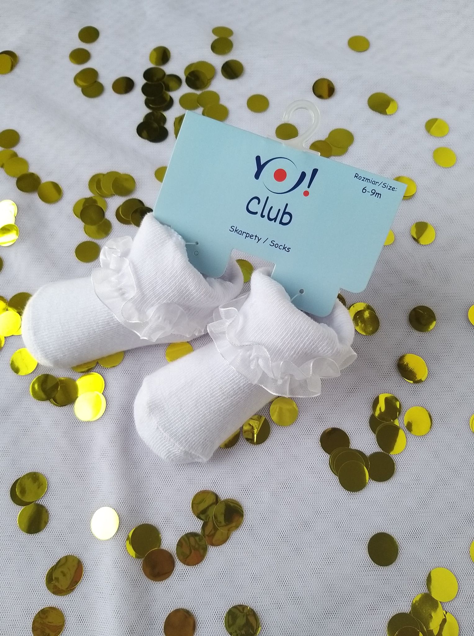 Skarpetki z falbankami w kolorze białym. Rozmiar z metki 6-9m