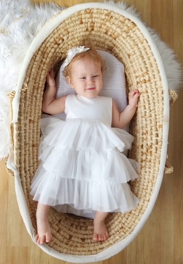 Piękna sukienka na roczek, chrzest bądź wesele. Góra sukienki uszyta z gładkiego materiału, dół to kilka warstw tiulu (w 3 rzędach). Model sukienki raczej dłuższy. W pasie piękny paseczek perełek. Sukienka na grubych ramiączkach w kolorze śmietankowym